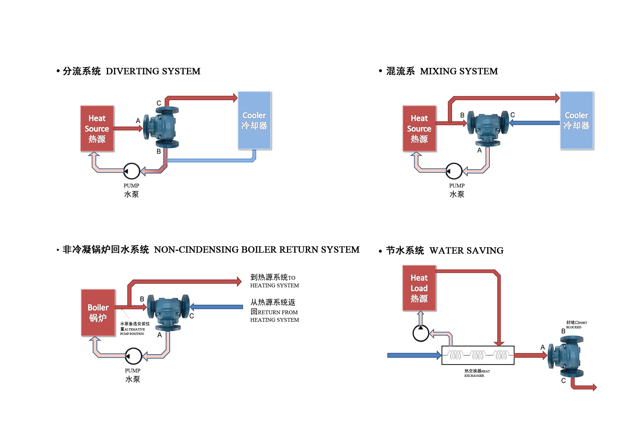當(dāng)溫控閥應(yīng)用于混流時(shí),高溫流體經(jīng)過B端口進(jìn)入溫控閥,而低溫流體則通過C端口進(jìn)入溫控閥,兩種不同溫度的流體將在溫控閥內(nèi)被調(diào)節(jié)到設(shè)定的溫度,最后經(jīng)過A口進(jìn)入到應(yīng)用系統(tǒng)中。