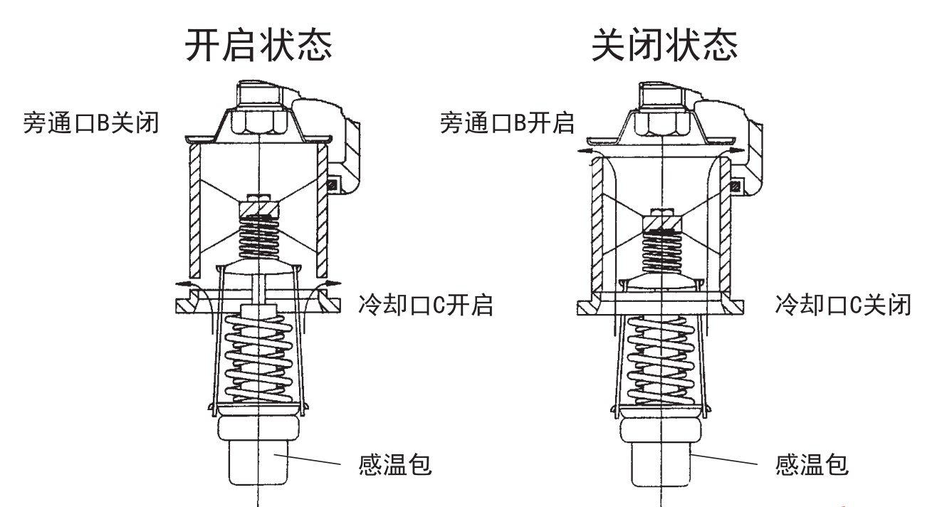 當(dāng)溫控閥應(yīng)用于分流時(shí),啟動(dòng)時(shí)所有流體均不經(jīng)過冷卻器,三通溫控閥是通過旁通口(B)返回系統(tǒng),而兩通溫控閥的出口則是被襯套堵住。當(dāng)流體溫度上升至可控制范圍時(shí),一部分流體將通過三通溫控閥的出口(C)進(jìn)入冷卻系統(tǒng),而兩通溫控閥則是直接將這部分流體排掉。因此,隨著介質(zhì)溫度持續(xù)上升,會(huì)有更多的流體經(jīng)過冷卻器或者被排掉。當(dāng)溫控閥處于完全打開狀態(tài)下時(shí),所有流流將通過冷卻系器或被排掉,從而達(dá)到調(diào)節(jié)溫度的效果。